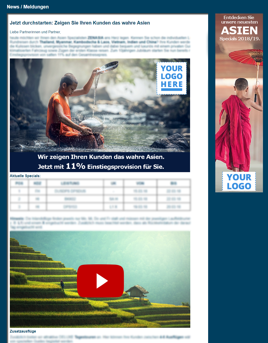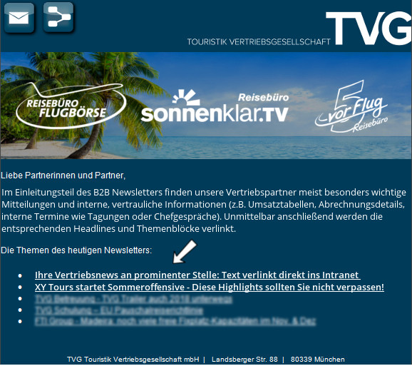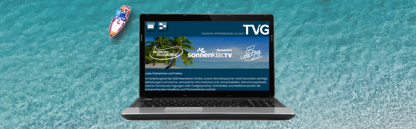 Der B2B Newsletter direkt aus der Zentrale der TVG informiert unsere Franchisenehmer, Reisebüro-Inhaber und Expedienten im Zwei-Wochen Rhythmus über Vertriebsneuigkeiten, spannende Specials und Angebote unserer Marketingpartner sowie Hilfestellungen bei der täglichen Arbeit im stationären Vertrieb. Dieser Newsletter ist wesentliche Informationsquelle unserer Reisebüro-Partner und erfährt daher eine außerordentliche hohe Akzeptanz und nahezu 100prozentige Öffnungsquote aller TVG Reisebüros.