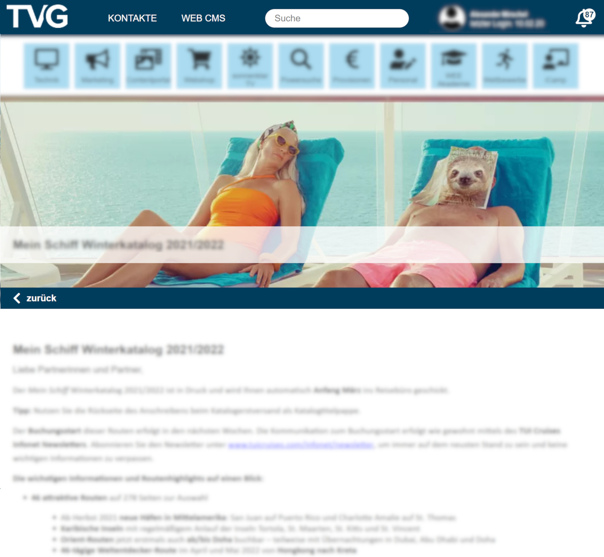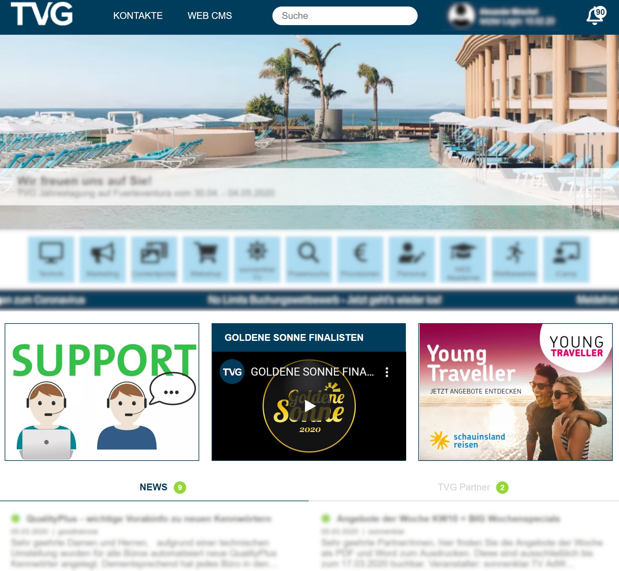 Das neu gestaltete Intranet der TVG ist die News- und Kommunikationsplattform für über 1.000 Expedienten, Inhaber und Büroleiter in mehr als 300 TVG Partnerbüros. Es bildet die wichtigste Anlaufstelle für aktuelle Vertriebsinformationen, Verkaufshilfen, Statistiken, interne Mitteilungen und wichtige Bekanntmachungen. Wir bieten Ihnen als Marketingpartner die Möglichkeit, mit einem eigenen Intranet-Newseintrag sowie einem Werbebanner auf der Startseite auf sich aufmerksam zu machen. Ihr Intranet-Eintrag erscheint auf der Startseite unter „News“ und ist auch nach Monaten noch bequem über das Archiv und die Suchfunktion auffindbar.