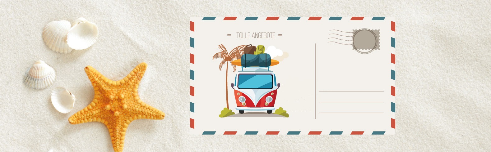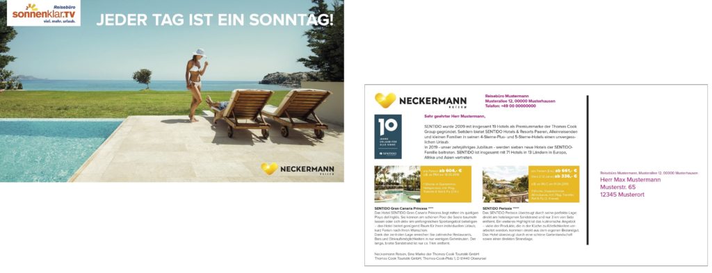 Durch die persönliche Anrede sowie zwei bis vier inkludierte Angebote auf der Rückseite wird Ihr Kunde direkt angesprochen und zum Buchen animiert. Absender der Maxipostkarte ist das jeweilige Reisebüro, welches mit Adresse und Telefonnummer auf der Karte dargestellt wird. Die Maxipostkarte ist sowohl für sonnenklar.TV als auch für Flugbörse Reisebüros im jeweiligem Look & Feel bestellbar.